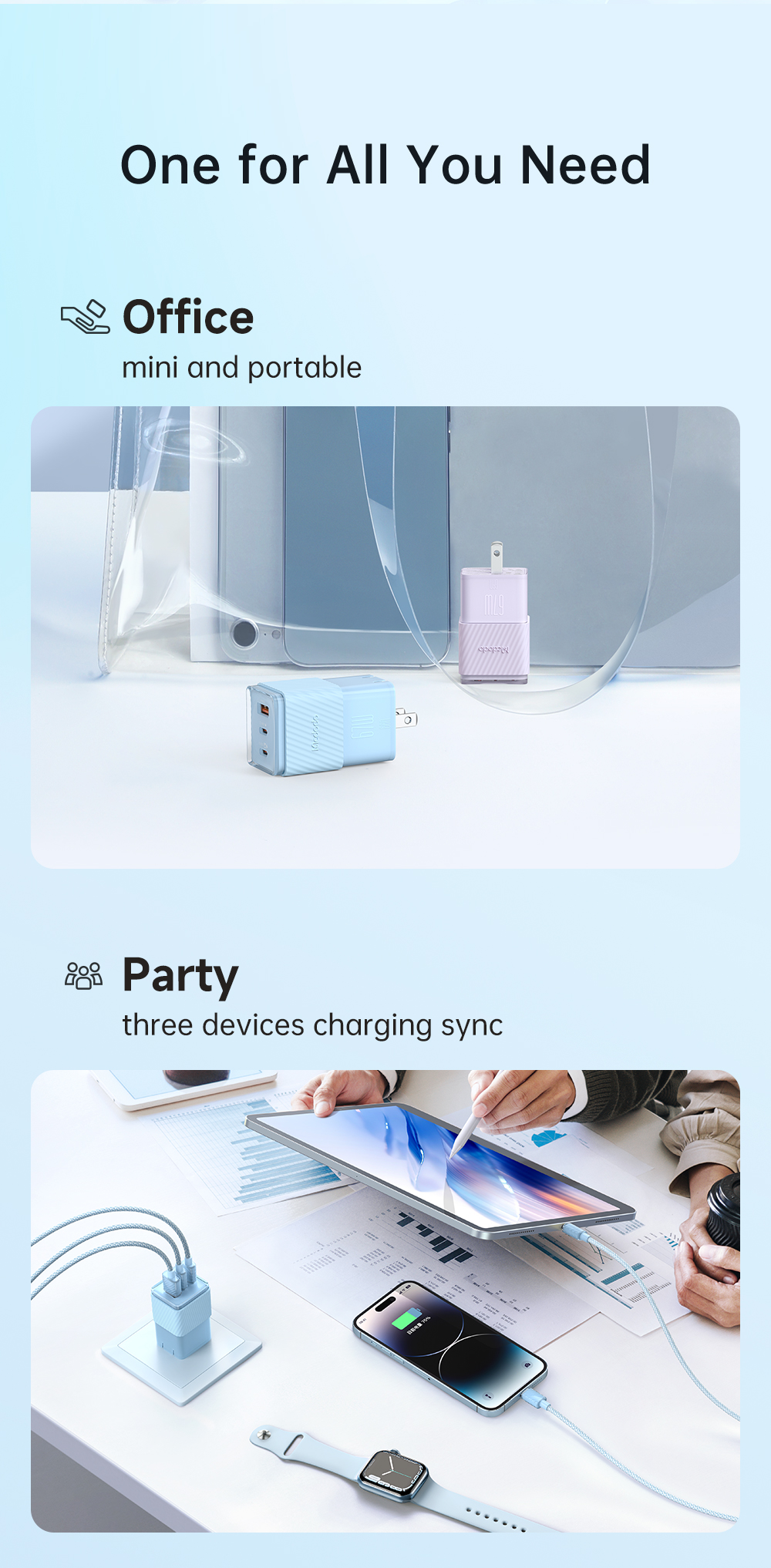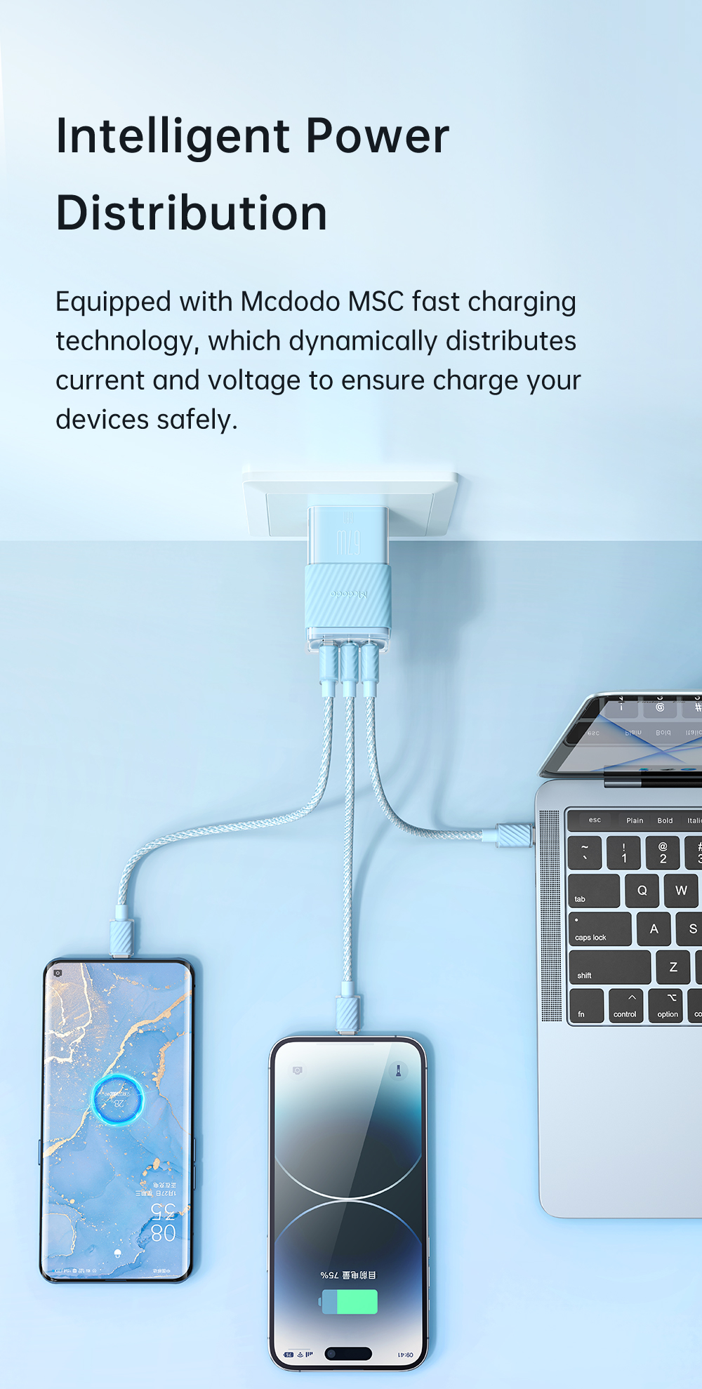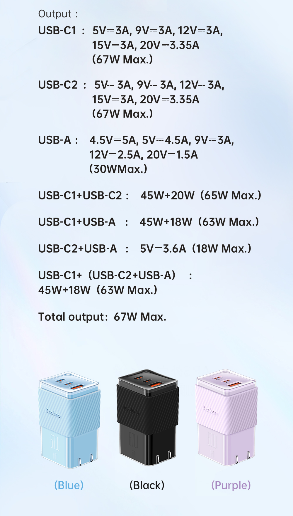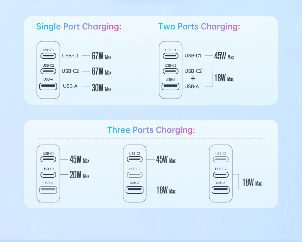 Với khả năng sạc nhanh lên đến 67W, bạn có thể nạp năng lượng cho nhiều thiết bị cùng một lúc mà không cần phải chờ đợi. Cùng với hai cổng Type-C và một cổng USB tích hợp, bạn có thể sạc đồng thời điện thoại di động, máy tính bảng, tai nghe không dây, và hơn thế nữa.